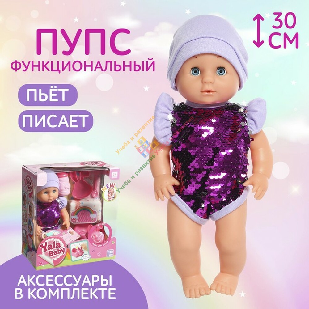 - В комплект входит соска, бутылочка, горшок, тарелочка, подгузник и ложечка. С этими аксессуарами ребёнок придумает множество весёлых игр.