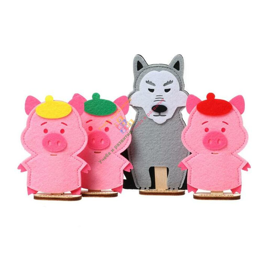 В наборе вы найдёте троих братьев-поросят Ниф-Нифа, Нуф-Нуфа, Наф-Нафа и грозного серого волка. Каждого персонажа можно установить на деревянные подставочки и расставить на столе или надеть на пальчики ребенка и устроить театральную импровизацию или сюжетную игру.