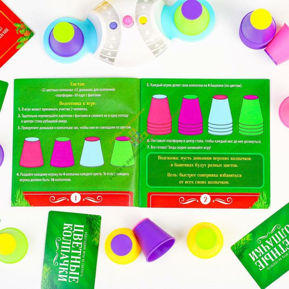 Скорость реакции, логика и ловкость рук — это всё, что понадобится в этой игре. Ведь здесь участникам предстоит строить башенки из колпачков. И всё бы ничего, но цвет колпачка и его донышка отличается! Кто станет победителем? Тот, кто быстрее соперника избавится от всех своих колпачков. А проигравший выполняет забавный фант.