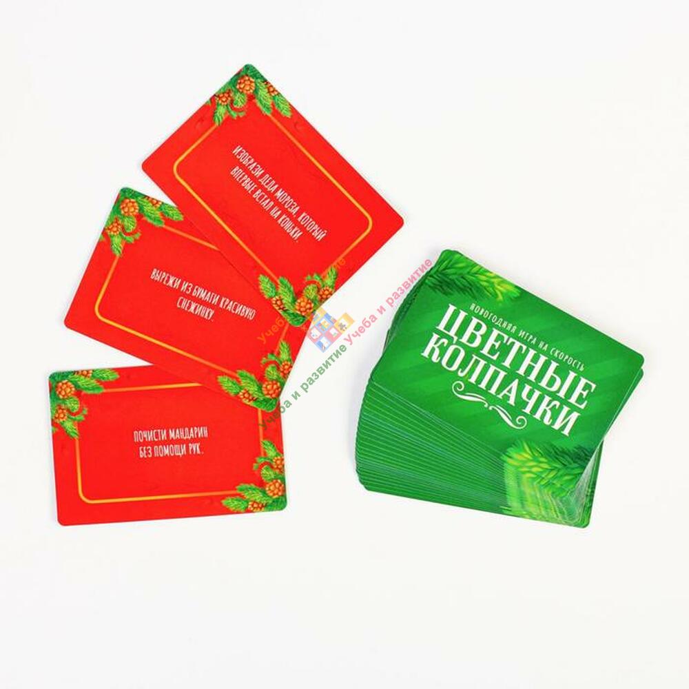 Тщательно перемешайте карточки с фантами и сложите их в одну колоду в центре стола рубашкой вверх. Прикрепите донышки к колпачкам так, чтобы они не совпадали по цветам.