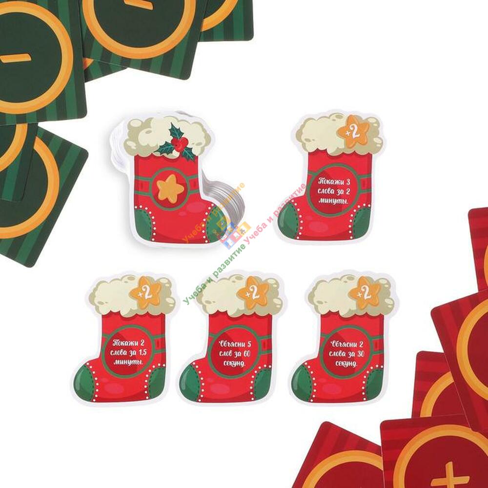 Вытягивайте карточку «носок», на которой написано количество слов и время для их объяснения, а дальше доставайте карты со словами и попробуйте сделать так, чтобы вас поняли. Чувствуете себя уверенно?! Добавьте в игру карточки «объясни» и «покажи». Например, попробуйте изобразить слово «борода из ваты», стоя с завязанными глазами. Для удобства подсчета победных баллов в набор входят карточки «+» и «-». В конце игры подсчитайте ваши баллы и определите победителя!