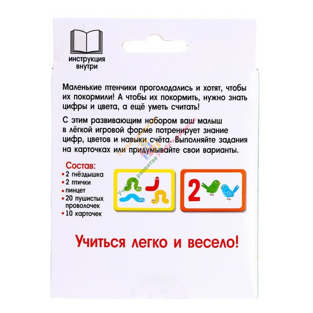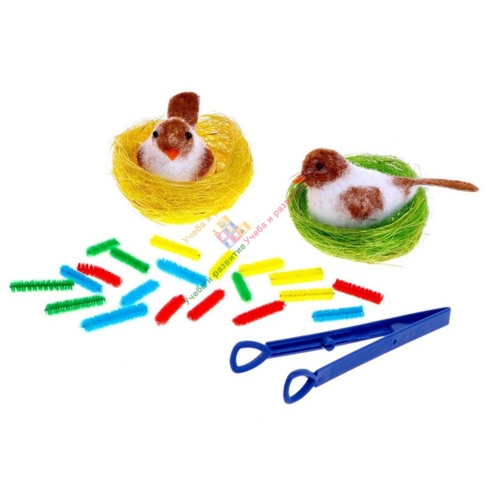В наборе 2 гнездышка, 2 птички, пинцет, 20 пушистых проволочек, 10 карточек.