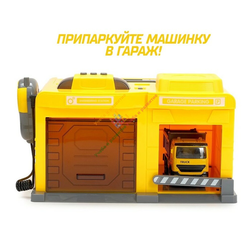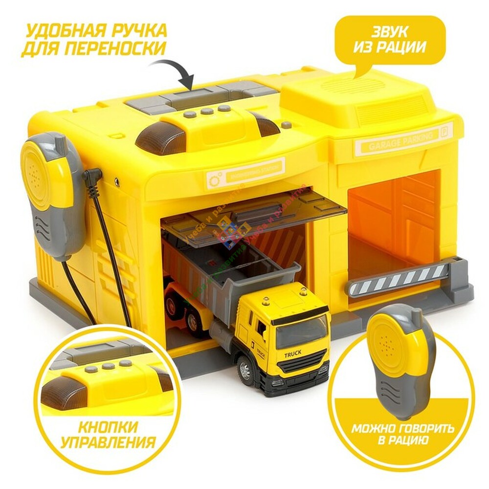 Парковка вместит все любимые машинки ребёнка. Транспортный комплекс оснащён рацией и громкоговорителем. Для удобства участок разделён на два гаража.