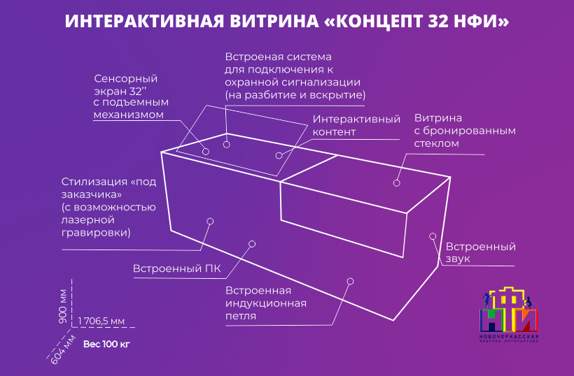 Отличительной особенностью интерактивной витрины «Концепт» 32 НФИ является индивидуальная стилизация комплекса, бронированные стекла с охранной сигнализацией и встроенная индукционная петля для слабослышащих посетителей музея.