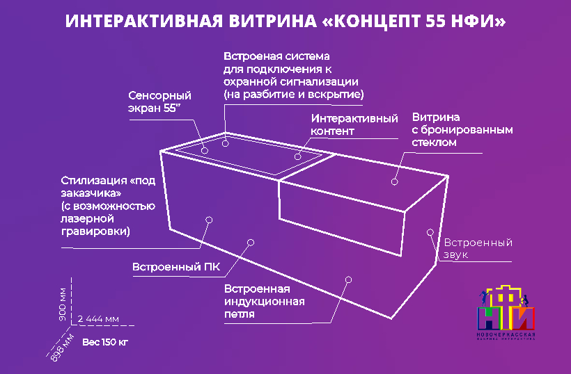 Отличительной особенностью интерактивной витрины «Концепт» 55 НФИ является индивидуальная стилизация комплекса, бронированные стекла с охранной сигнализацией и встроенная индукционная петля для слабослышащих посетителей музея.