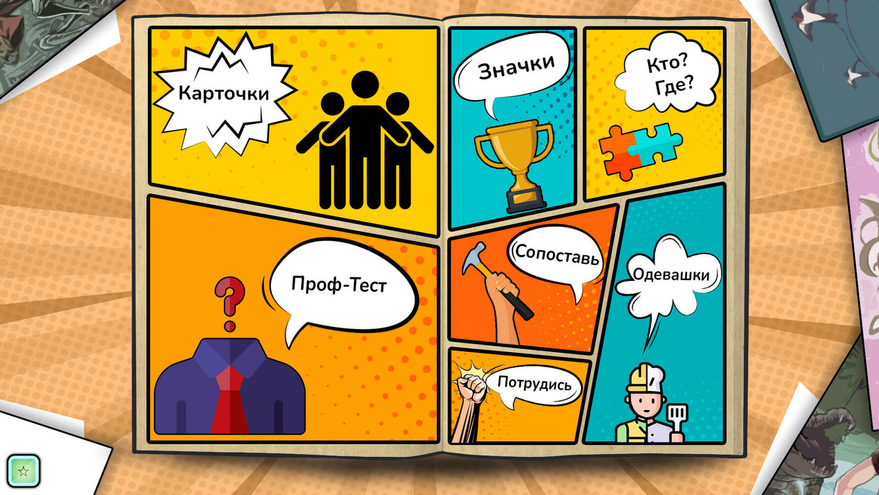Раздел представлен вопросами о предпочтениях в деятельности. Каждый вопрос проиллюстрирован и присвоен к определенной категории профессий. По прохождению теста, ребенку откроется меню с наиболее приемлемыми для него сферами профессий.