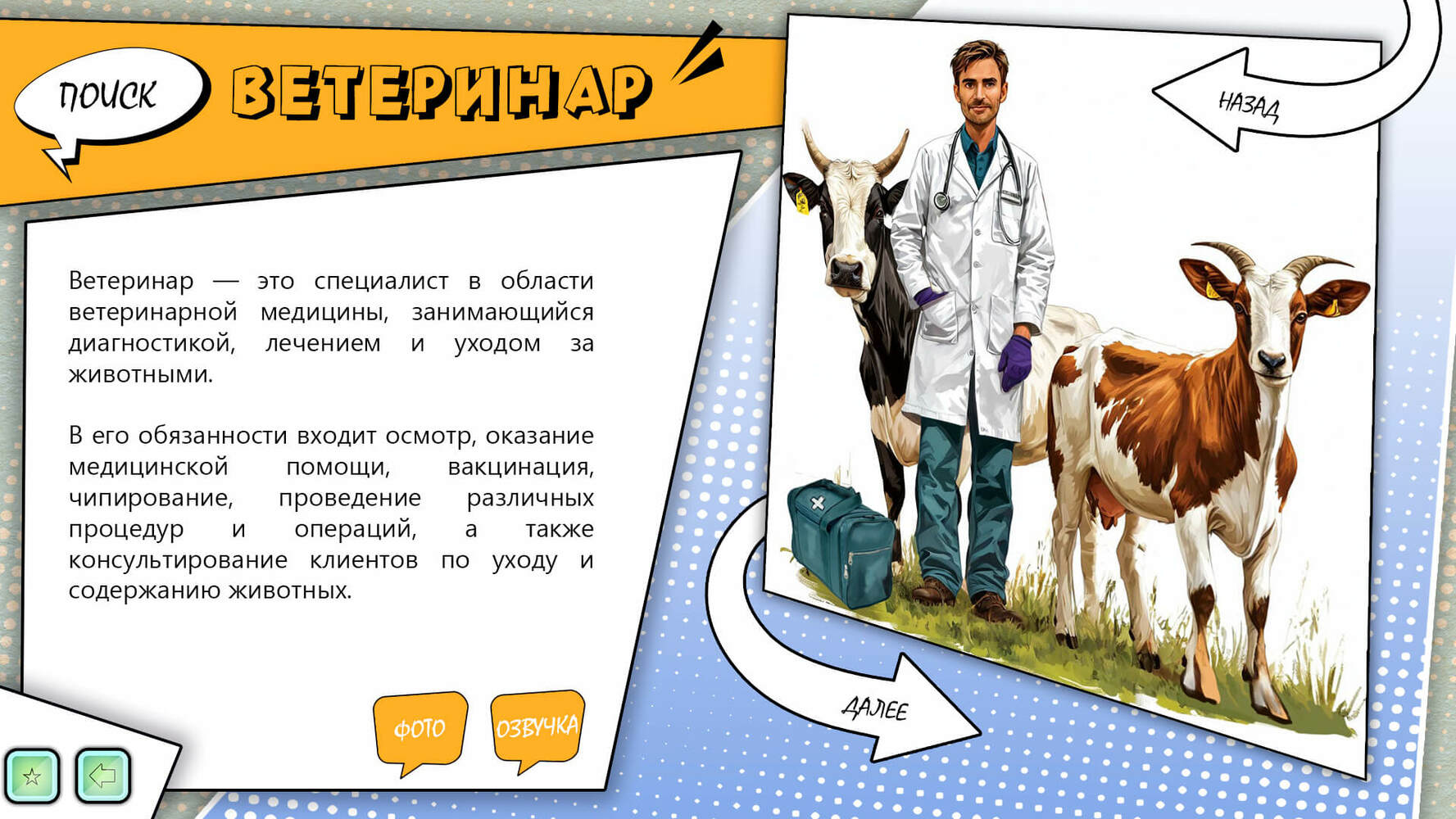 Это раздел представляющий собой подробную картотеку профессий, распространенных на территории РФ, и включает 150 наименований. Каждая профессия представлена иллюстрацией человека в униформе его профессии, фотоколлажами рабочих мест и атрибутики, подробной текстовой информацией с озвучкой. Также имеется кнопка поиска для выбора определенной категории профессий.