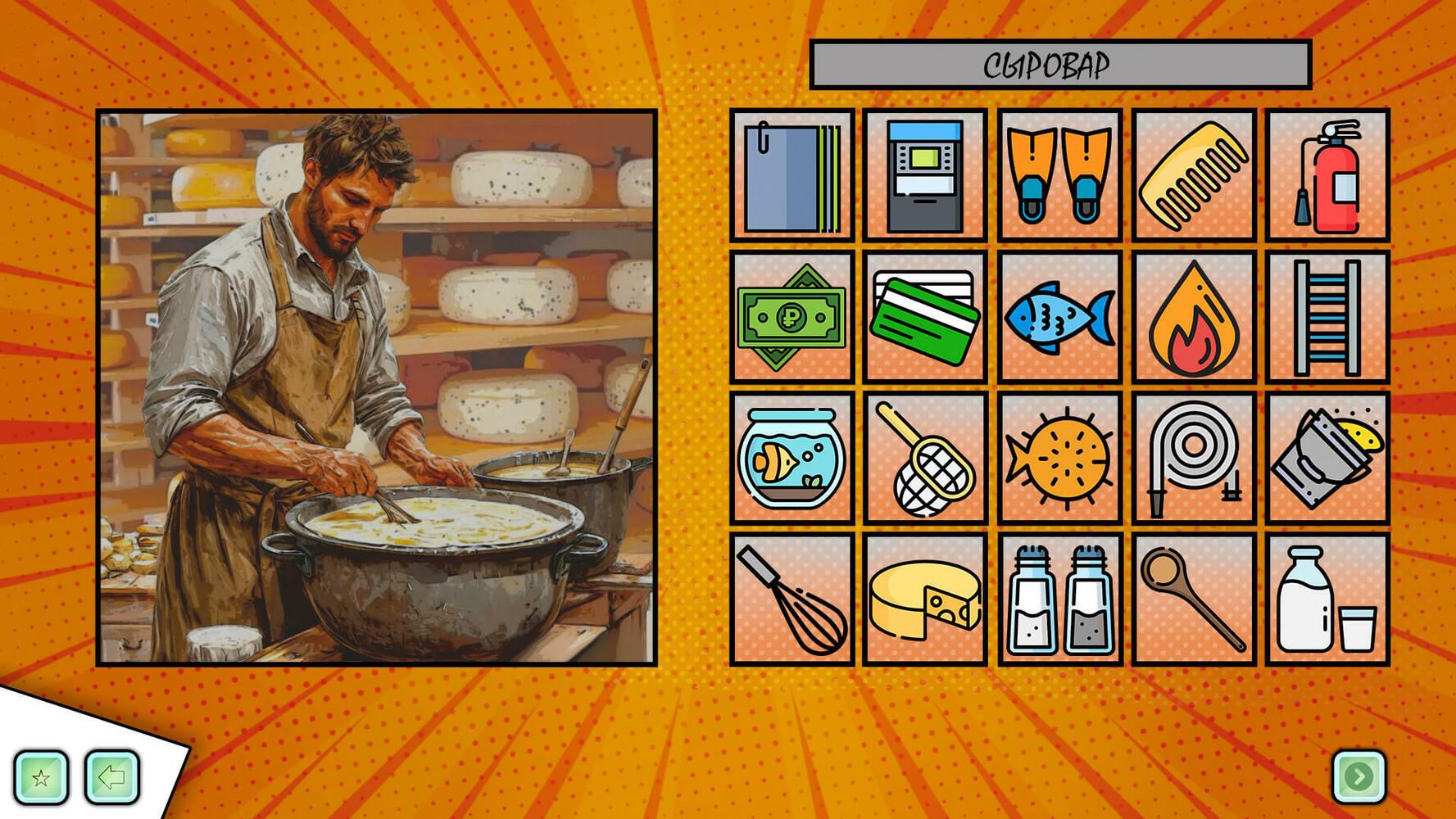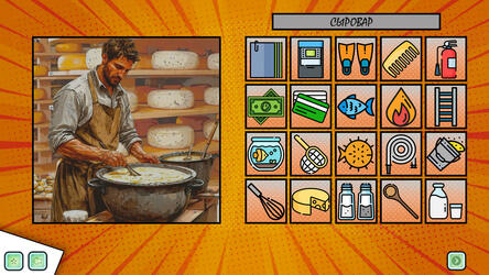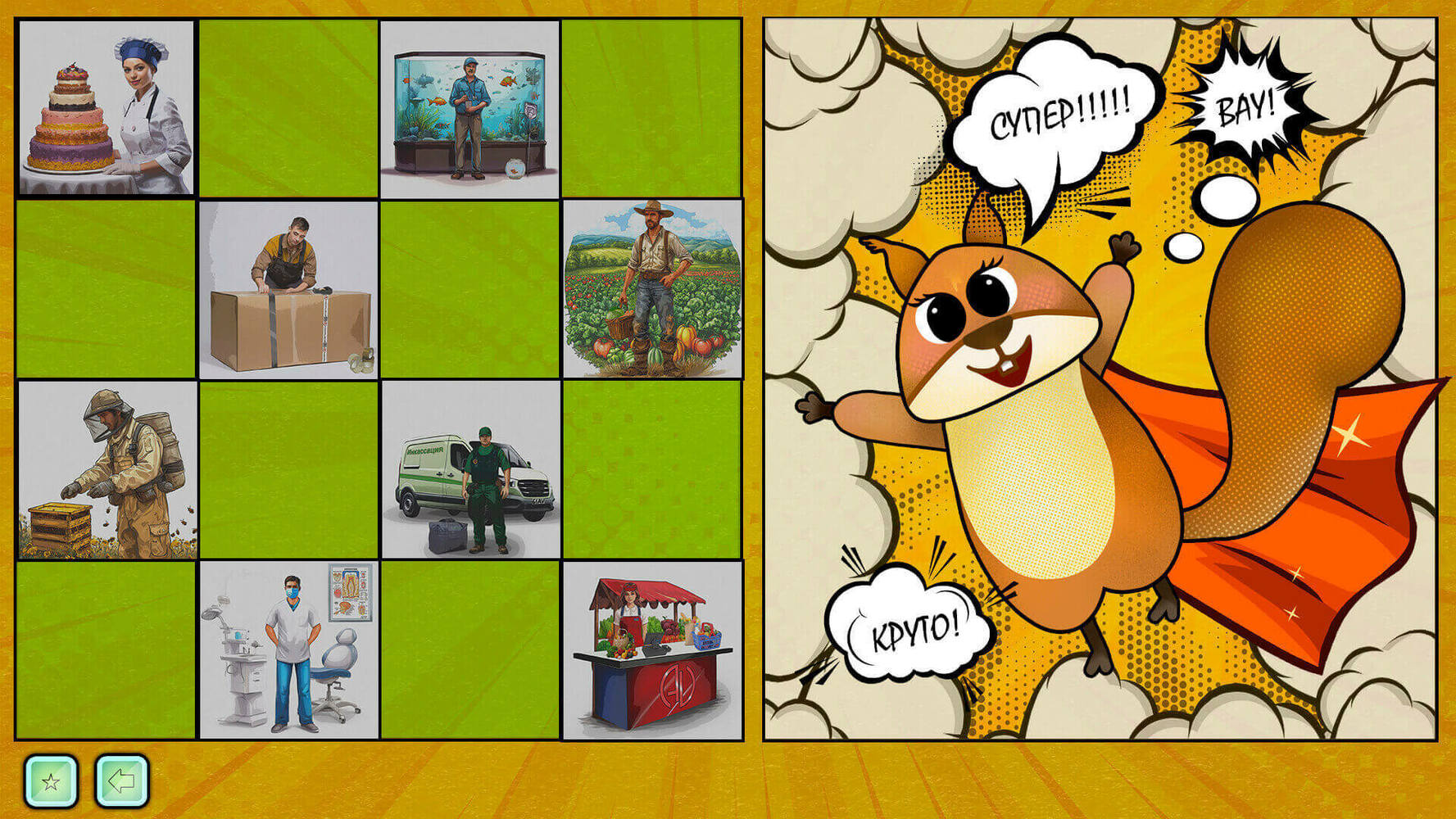 Упражнение выполнено в стилистике всем известной бумажной игры с переодеваниями персонажей в различные костюмы. На выбор представлены женский и мужской персонажи, по умолчанию без униформы. Задача игрока пользуясь представленным перечнем иллюстраций одежды, одеть персонажа в костюм профессии, название которой будет появляться на табличке персонажа-помощника Белочки.