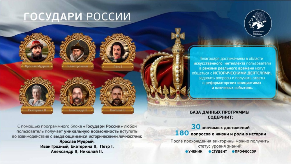 В программе "Роснаследие. Диалоги с Великими" пользователи общаются в режиме реального времени с историческими личностями, внесшими вклад в культурное и историческое наследие России. Помимо диалогов, программа включает викторины, биографию от первого лица и чтение авторами собственных произведений.