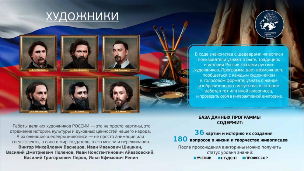 - Программа позволяет взрослым и детям напрямую общаться с анимированными образами В.М. Васнецова, И.И. Шишкина, В.Д. Поленова, И.К. Айвазовского, И.Е. Репина, В.Г. Перова в режиме реального времени с использованием ИИ. Художники рассказывают истории своей жизни, творчества и представляют 36 самых популярных русских классических картин для изучения и знакомства с обстоятельствами их написания.