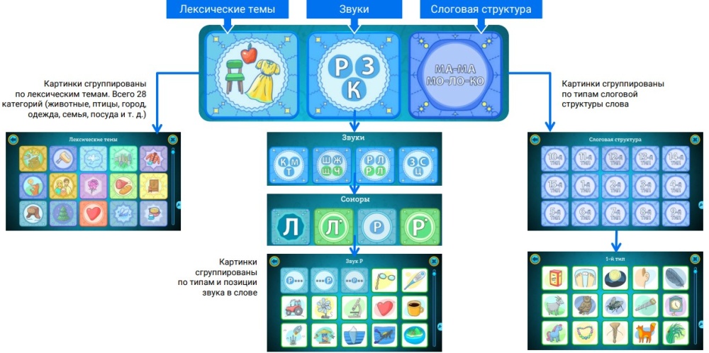 • Более 400 тематических картинок для изучения основных лексических тем, отработки звуков, а также слов разных типов слоговой структуры