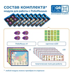 • 23 тематических поля для РобоМыши: "Деревья", "Цветы", "Грибы", "Овощи", "Фрукты", "Ягоды", "Домашние животные", "Дикие животные", "Животные в зоопарке", "Птицы", "Насекомые", "Обитатели рек и озер", "Животные Красной книги", "Природные чудеса России", "Я помогаю природе", "Полезные ископаемые России", "Водные ресурсы России", "Лесные ресурсы России", "Народы России", "Народные промыслы", "Наша Победа: Великая Отечественная война", "Гордость России", "Карта России";