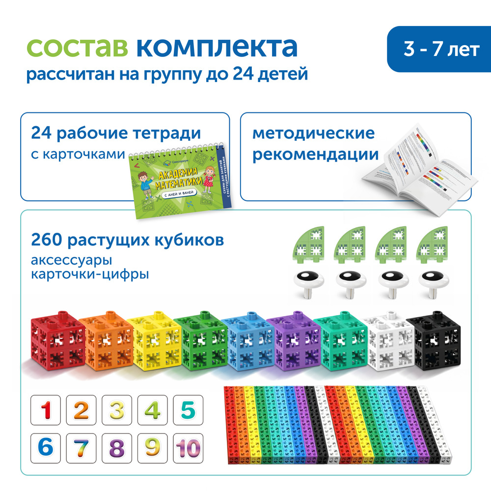 Основа комплекта — инновационные «Растущие кубики Сенсориум». Это первые кубики, соединяющиеся со всех 6 сторон, которые служат готовой дидактической системой для изучения арифметики.